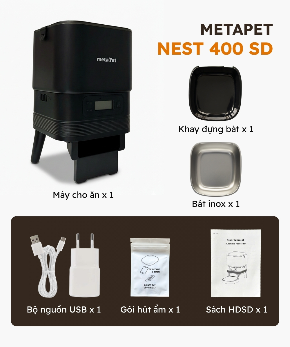 Máy Cho Thú Cưng Ăn metaPet NEST 400 SD là trợ thủ đắc lực giúp bạn chăm sóc thú cưng dễ dàng và khoa học hơn. Với thiết kế thông minh, máy cho phép cài đặt thời gian và khẩu phần ăn linh hoạt, đảm bảo bé cưng luôn được ăn đúng giờ kể cả khi bạn bận rộn. Dung tích vừa phải, vận hành ổn định và chất liệu an toàn giúp bảo quản thức ăn tốt hơn, mang lại sự tiện lợi và yên tâm cho mọi gia đình nuôi thú cưng.