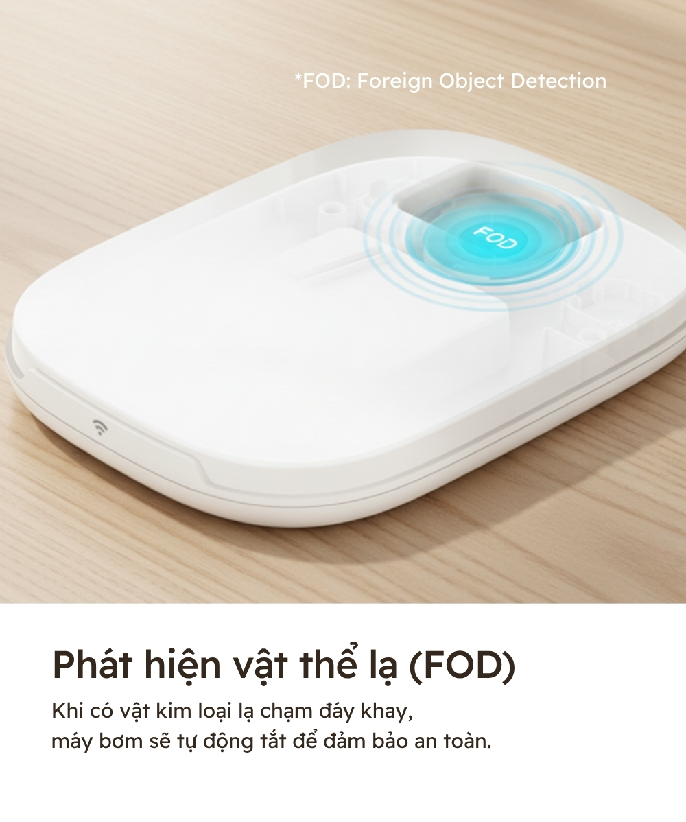 A: Rất an toàn. Máy sử dụng bơm không dây và công nghệ FOD giúp tự ngắt khi phát hiện vật kim loại lạ, hạn chế rò rỉ điện.